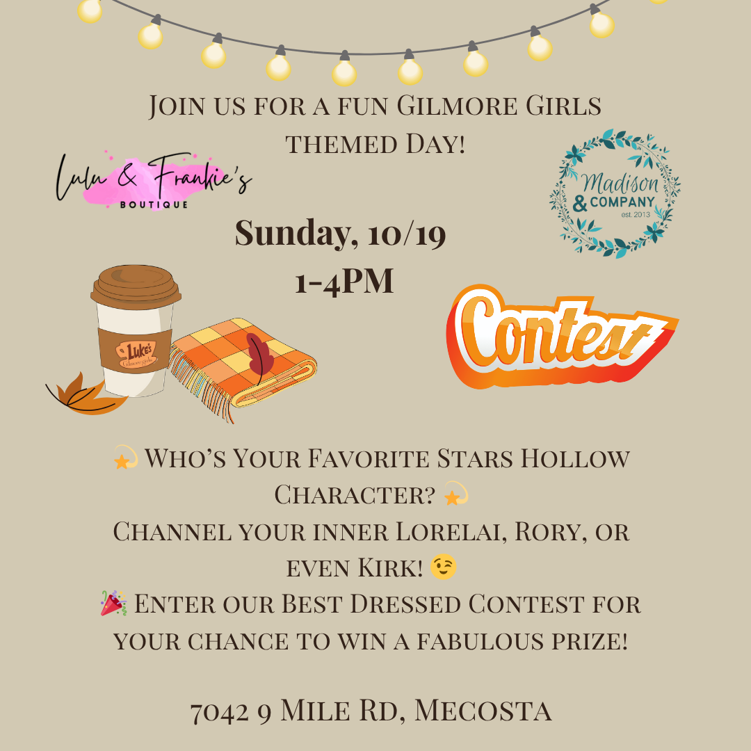 Hey friends! Just popping in with a cozy little reminder — our Gilmore Girls–themed event is happening this Sunday, Oct. 19th from 1–4 PM at Lulu & Frankie’s + Madison & Co (7042 9 Mile Rd, Mecosta)!