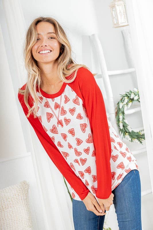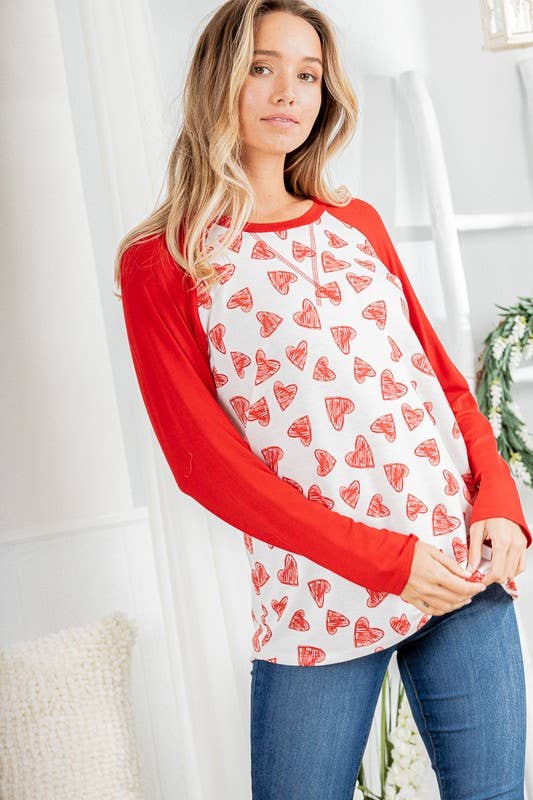 Fall in love with cozy charm. This ivory and red long-sleeve top features an allover Valentine scribble heart print with contrast stitching for a playful, eye-catching finish. Soft, stretchy, and easy to style, it’s perfect for Valentine’s Day and beyond — dress it up with denim or keep it casual with leggings.