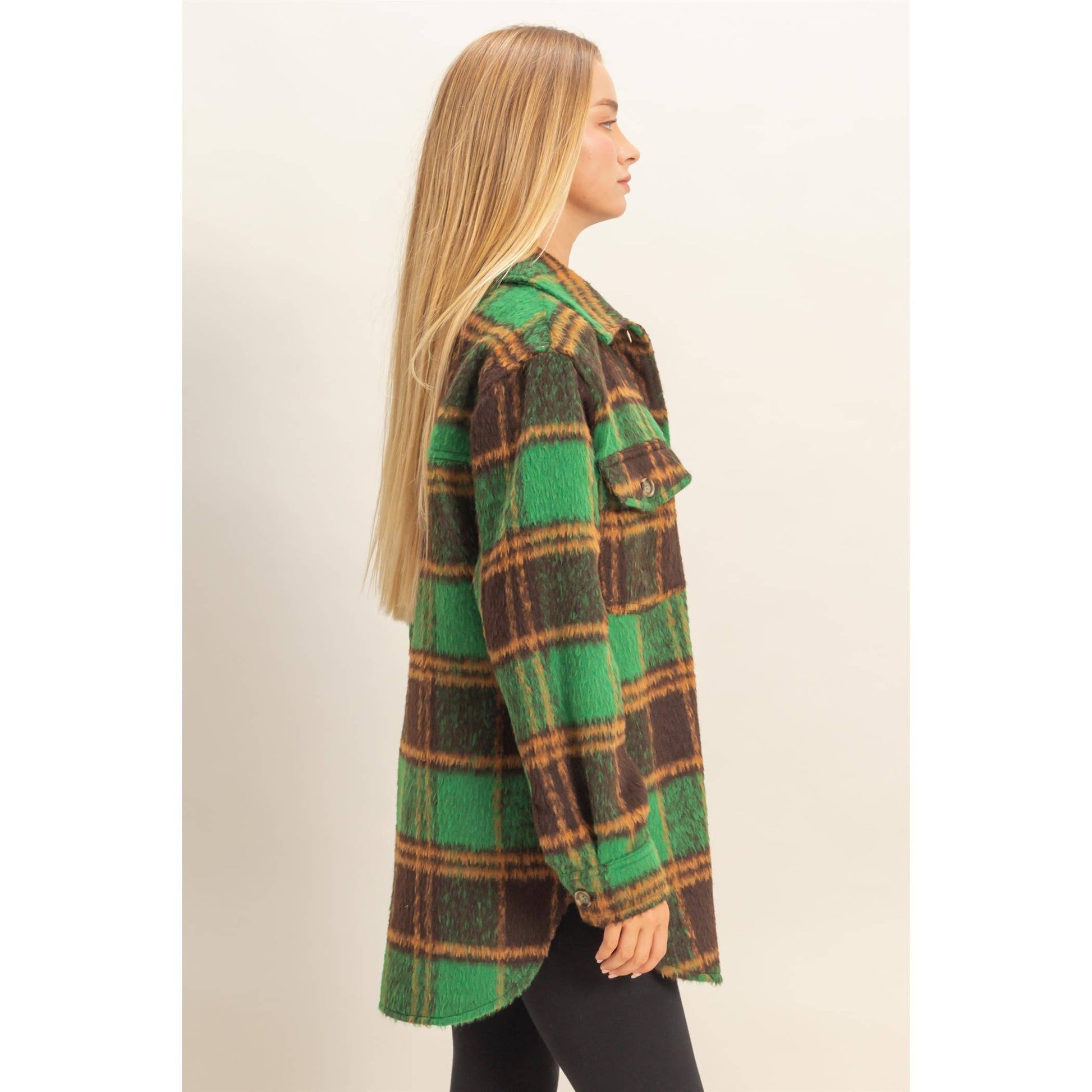 Designed with a point collar, effortless drop shoulders, and long sleeves, it offers a relaxed, comfortable fit. The button-front bodice includes twin front-flap pockets, adding functional style to this chic wardrobe staple. Crafted from 80% polyester, 10% cotton, and 10% acrylic, it’s soft, lightweight, and easy to wear. Available in green plaid accented with chocolate brown and tan, it’s perfect for pairing with jeans, leggings, or skirts.