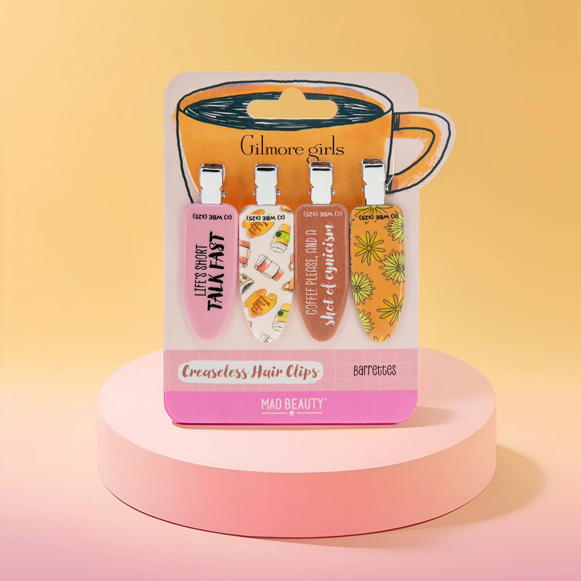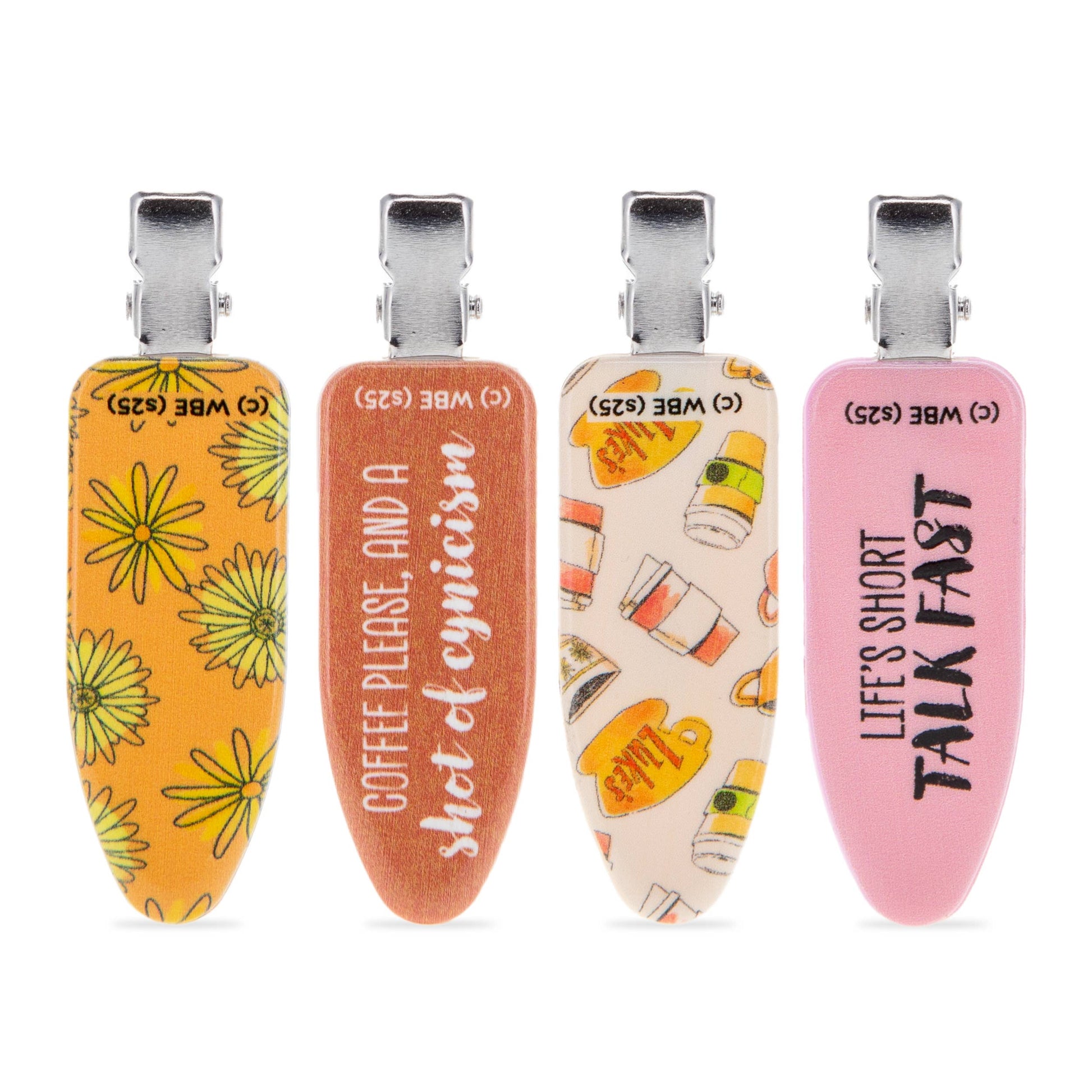 Keep your hair in place with this four pack of creaseless hair clips, each featuring fun slogans and iconic symbols from the Gilmore Girls. These clips provide a comfy, no-crease hold that keeps your hair secure without sacrificing style. Perfect for adding a little Stars Hollow charm to your daily routine!