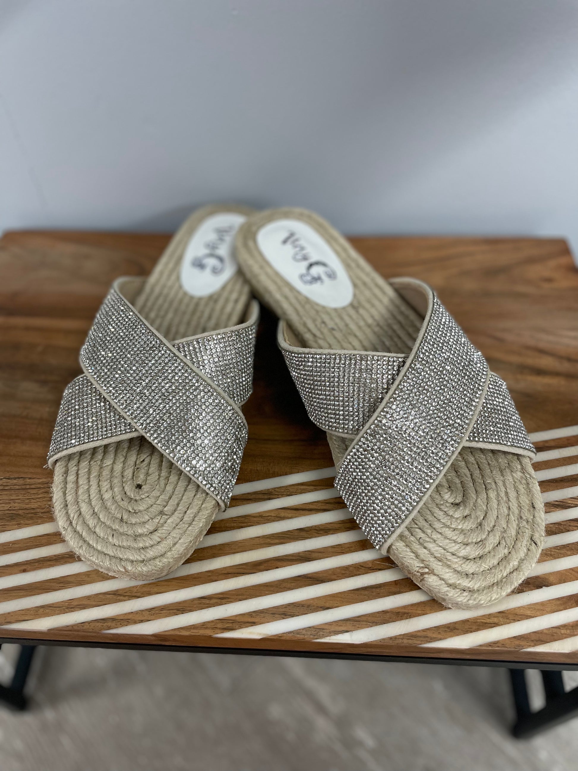 Move your feet with a little extra sparkle and style! Our Sparkle Sandal boasts a classic look with a twist, featuring a sparkle upper and natural rope bottom for cute, comfy vibes. Sparkle on!