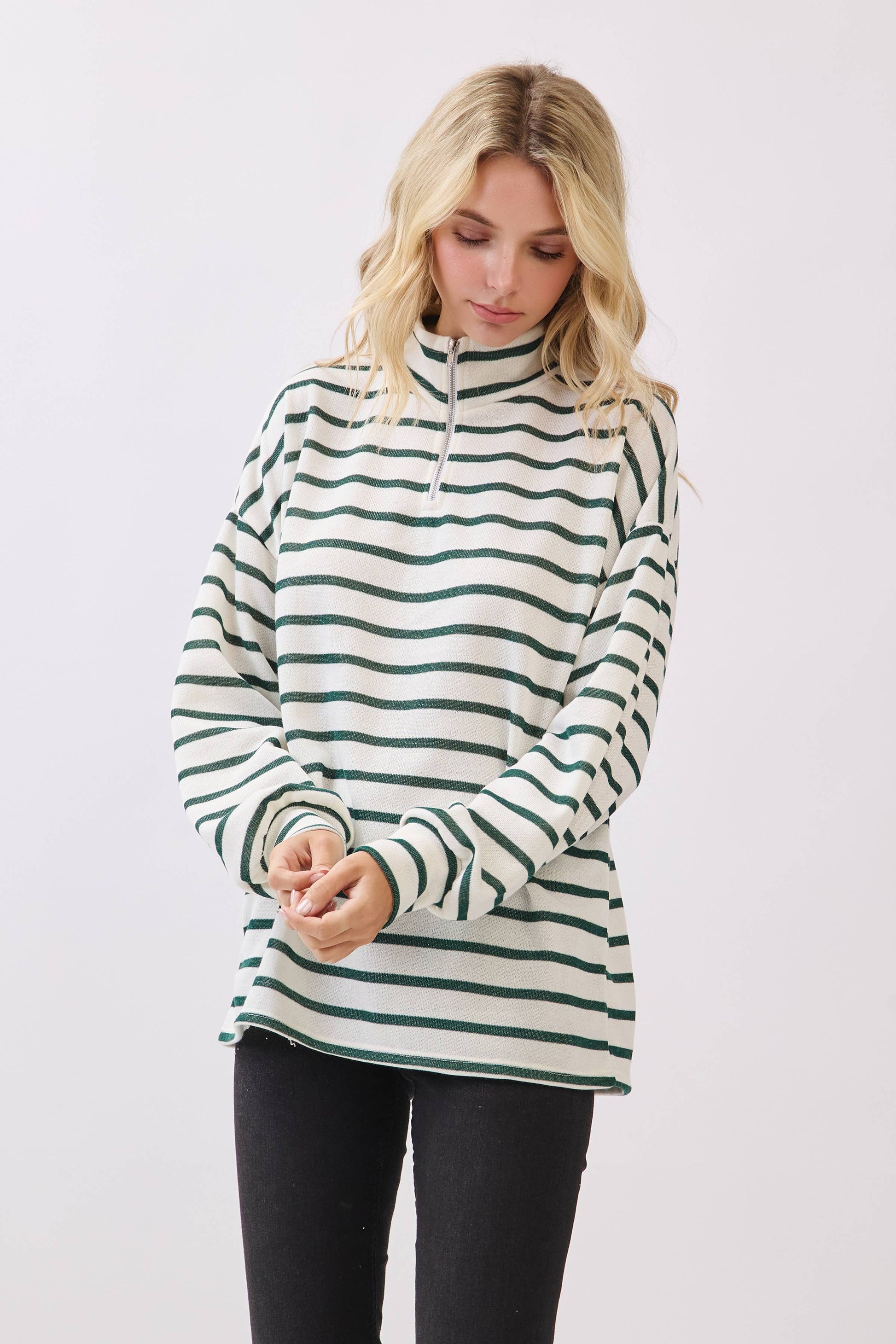 Our Striped Half-Zip Knit Pullover in green and white is the perfect blend of casual comfort and everyday style. The classic stripe pattern keeps it timeless, while the half-zip neckline with a fold-over collar gives it that sporty-chic vibe we’re loving.